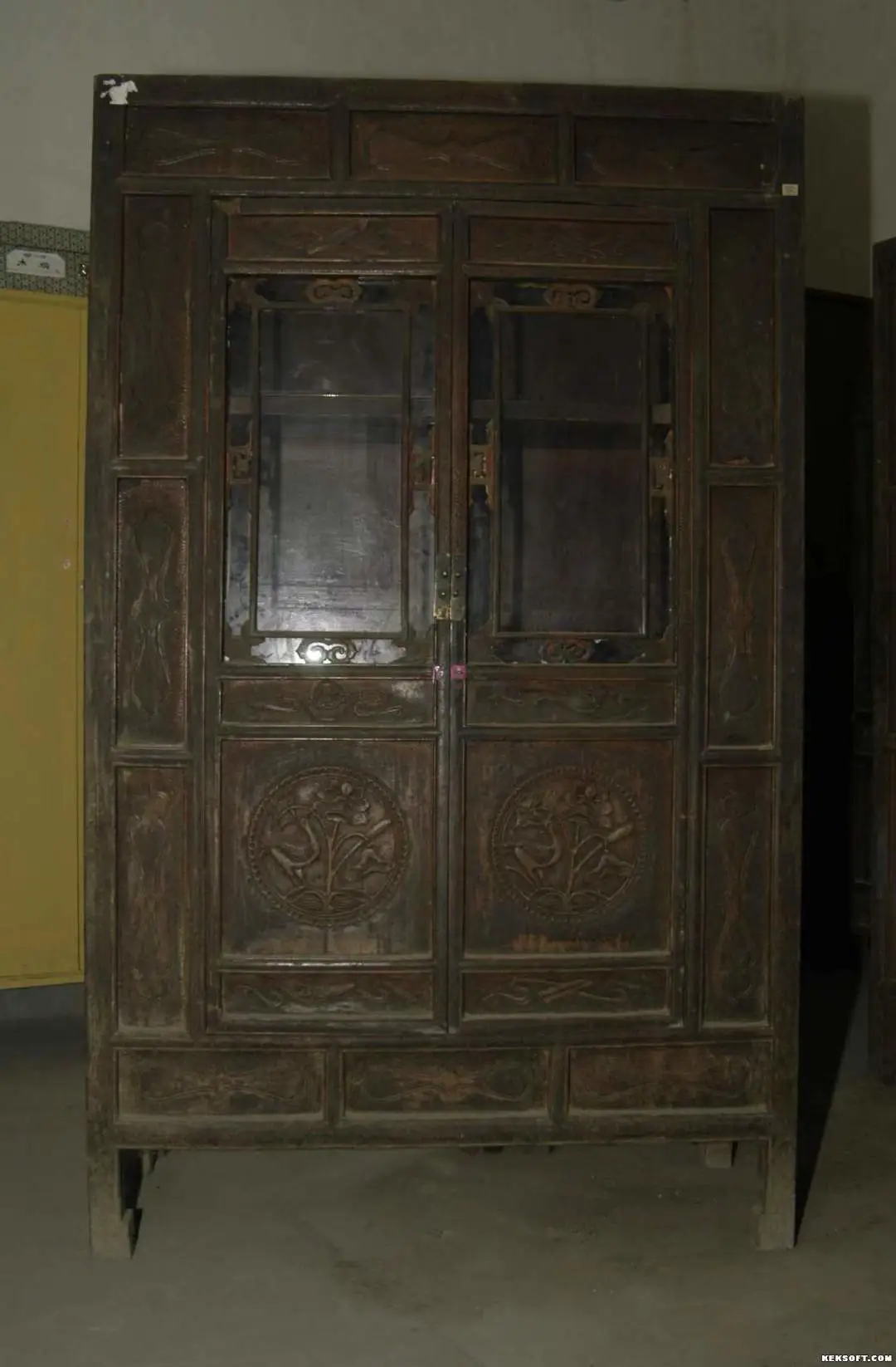 今天为大家分享浮雕双凰八宝纹木柜。清代,漆木器。松木质,竖长方形,四足。内两层隔板,正门正中两扇门,两扇四周及柜阴刻葫芦形花纹。门扇上粘贴浮雕八宝纹。门扇下方格中粘贴浮雕双凰。为国家三级文物。现藏武威市博物馆。