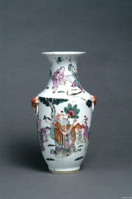 大家好,今天向大家分享的是“福禄寿三星图”五彩瓷瓶,明代瓷器,侈口,长束颈,方肩,深直腹,上腹部有衔环辅首一对,圈足。白胎白釉,五彩纹饰。颈部饰三童子戏鸟图,腹部为福禄寿三星。为国家三级文物,现藏于武威市博物馆。