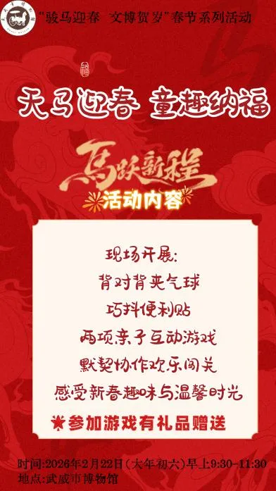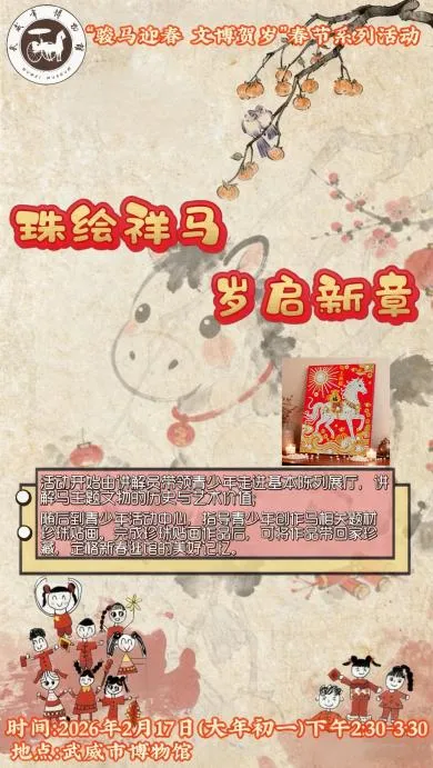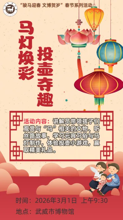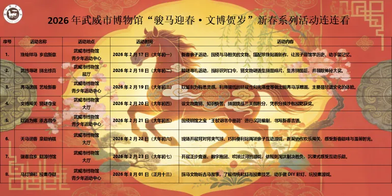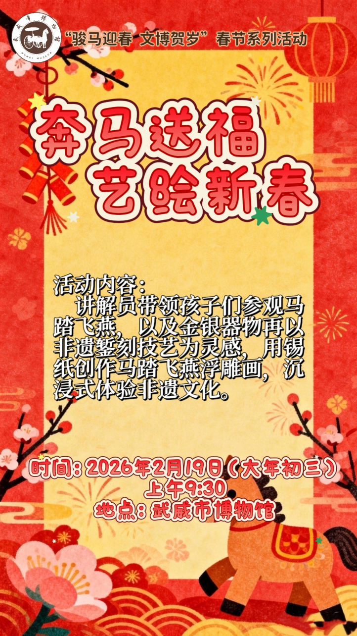 岁启丙午,骏马献瑞;文脉赓续,文博迎春。为迎接马年春节,武威市博物馆特推出“骏马迎春 文博贺岁”新春系列社教活动,以大汉天马之雄姿、凉州文脉之厚重,邀市民与游客共赴一场跨越千年的文化之约。