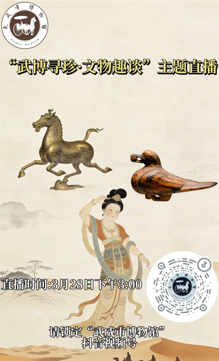 3月28日下午3:00,锁定武威市博物馆官方抖音直播间,让我们循着文物足迹,聆听凉州往事,感受千年华夏的文明风采,共赏丝路故地的历史风华!