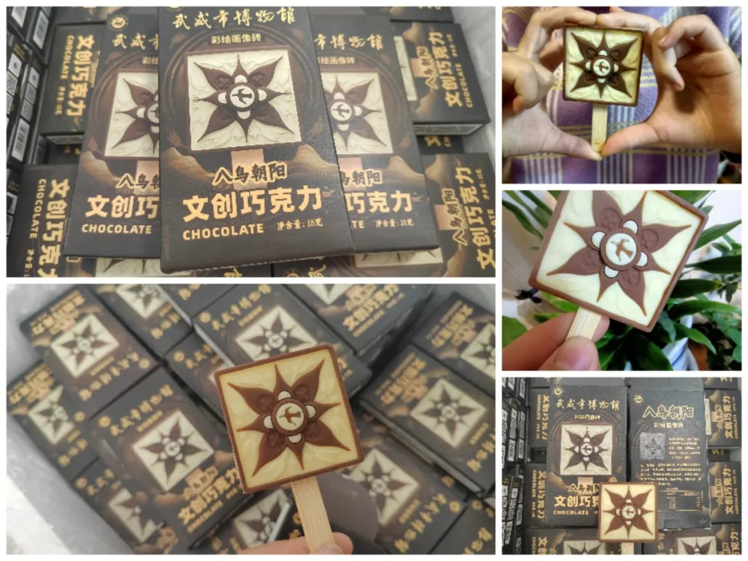 八鸟朝阳巧克力:“八鸟朝阳彩绘画像砖”可以说是武博的人气王了。它那红唇黑身的三足金乌是太阳的象征,寓意向阳而生,向往光明。