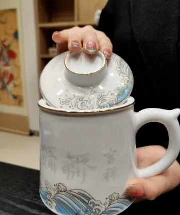 玲珑杯:吉祥玲珑杯采用景德镇玉瓷工艺制作,杯身主题图案采用手工镂空雕刻工艺,呈现出立体透视感。