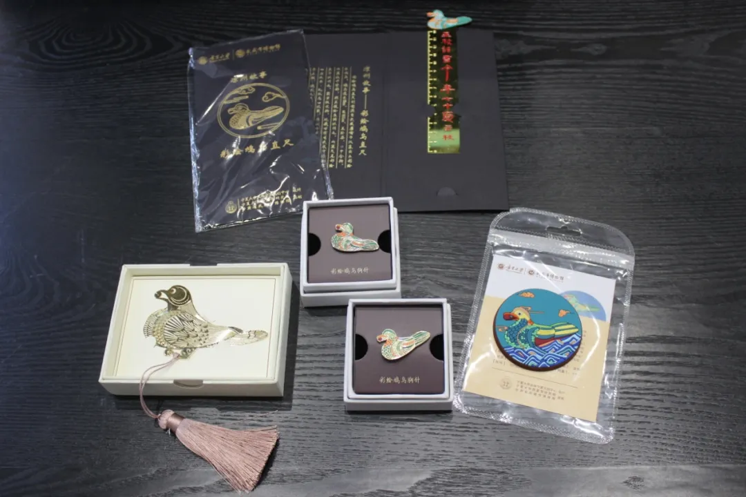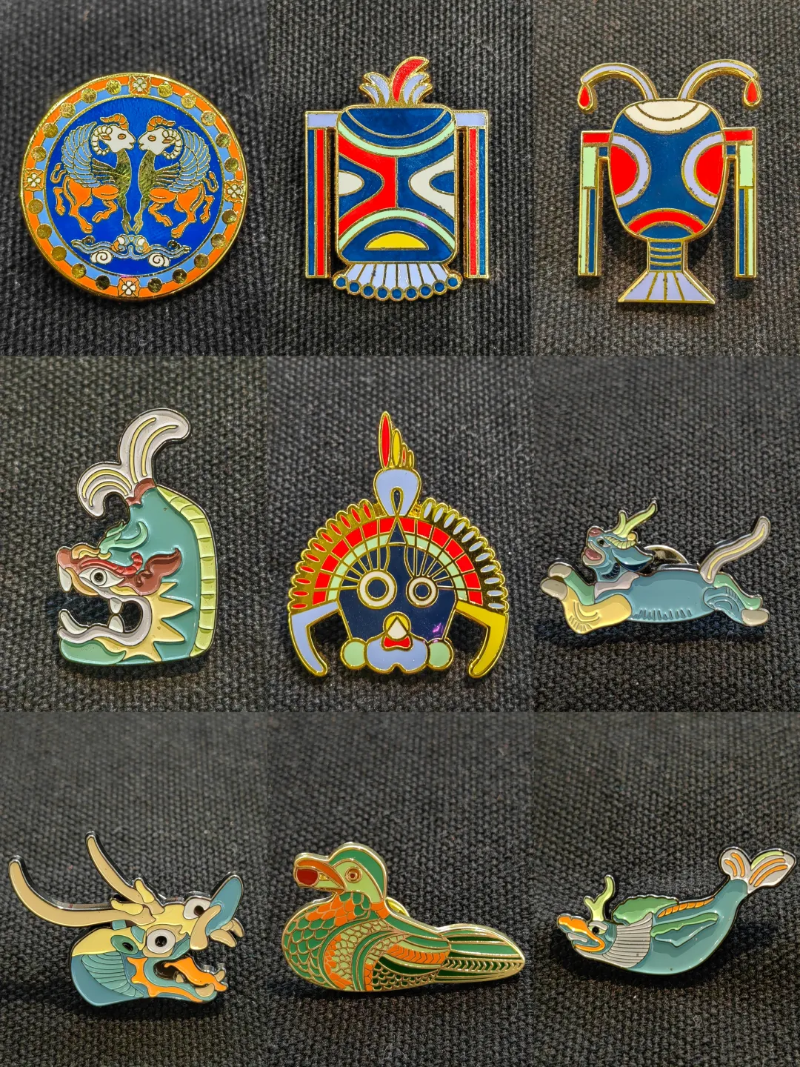 胸针:采用武威馆藏文物鸠鸟、龙等形象,使胸针活灵活现。金属材质,色彩艳丽。