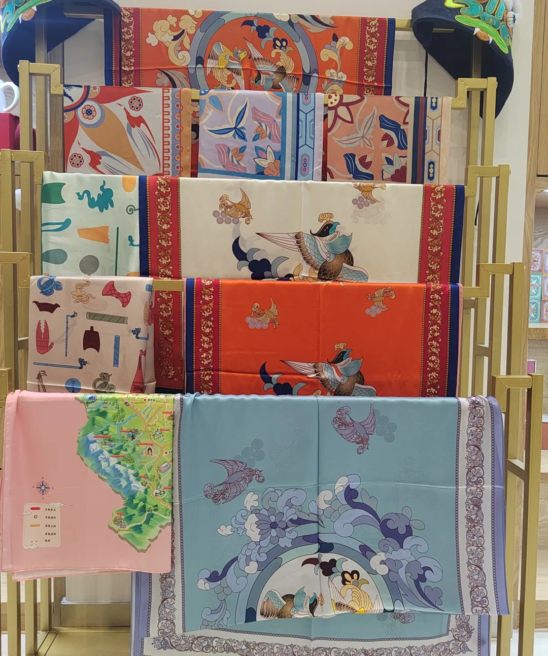 八鸟朝阳小方巾、西凉乐器丝巾:设计时采用市博物馆馆藏二级文物八鸟朝阳、西凉乐舞的乐器元素等为设计灵感,真丝材质,色彩艳丽。