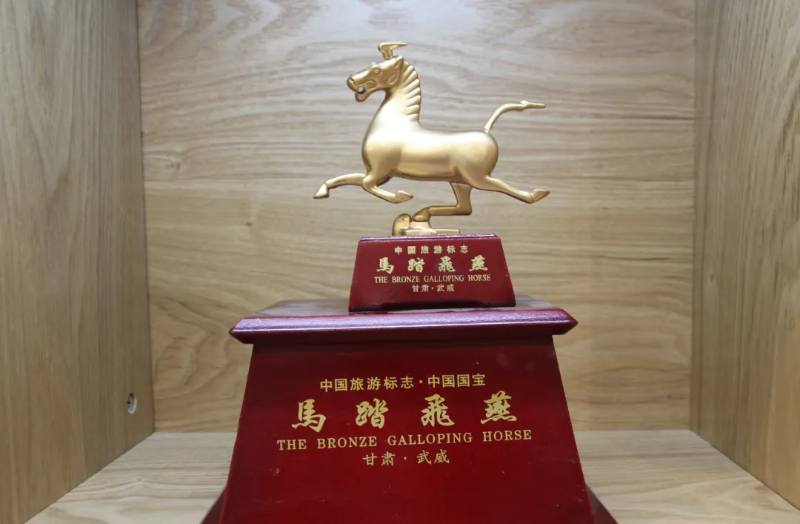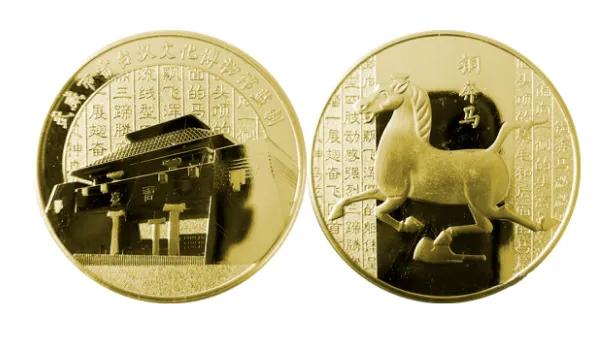 铜奔马镀金纪念章:正面图案为铜奔马雕塑,背景由铜奔马的文字介绍组成;背面图案主景为武威市雷台汉文化博物馆大门全景雕塑,两面均辅以条状、环状等纹饰。