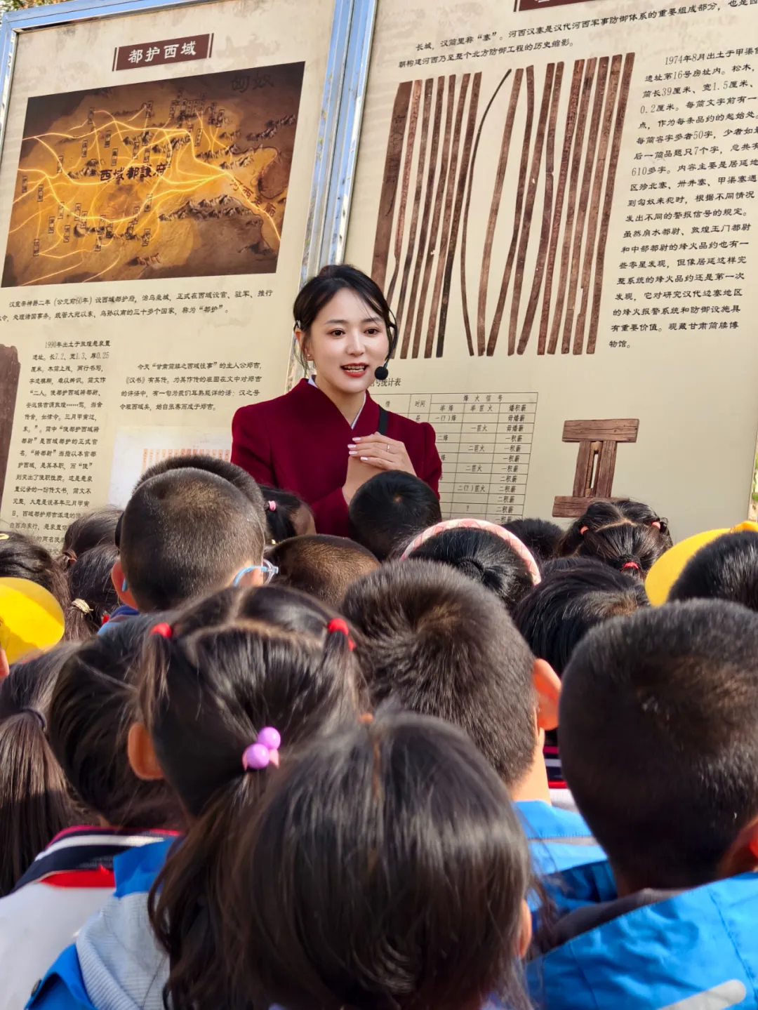 武威市博物馆讲解员用古人的书信,纸上的历史课等通俗表达解读展板内容,引导学生观察文献细节、提问交流。不少学生围着展板仔细阅读,有的拿出笔记本记录感兴趣的历史片段,还有学生主动分享自己从展板中了解到的民族故事,现场学习氛围热烈。