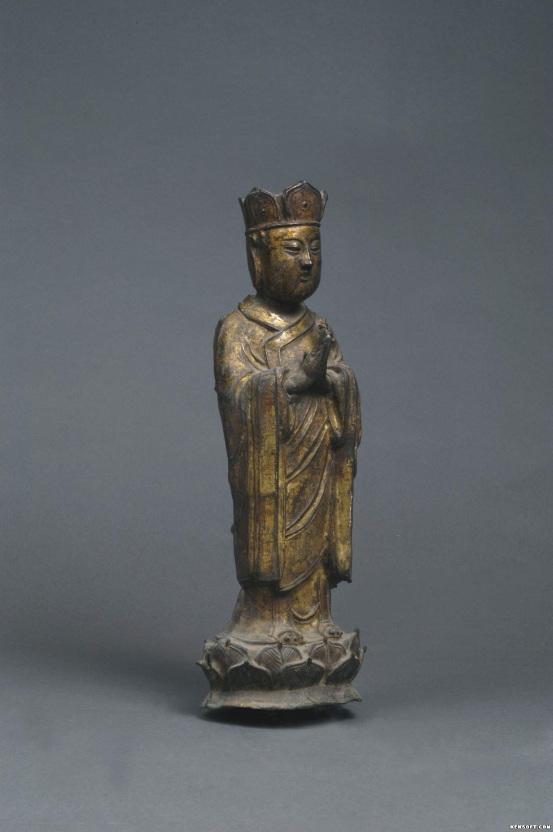 今天为大家分享的是明代铜器鎏金高僧铜立像。通体鎏金,立束腰双层莲座上,双手合十,头戴五智冠,双耳垂肩,面容丰满,着长袍,宽袖,左肩披袈裟,有环带连接,足着僧靴。人物刻画细致传神,为国家三级文物,现馆藏于武威市博物馆。