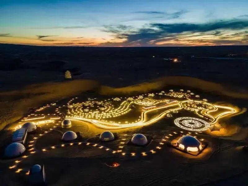 在阒然无声的夜,万物在玄黑一色里寂然悠远。位于民勤的摘星小镇,整体设计轴线以“银河”为中心,“栖身银河,手可摘星”,这个电影里的浪漫情节在这里变成现实。