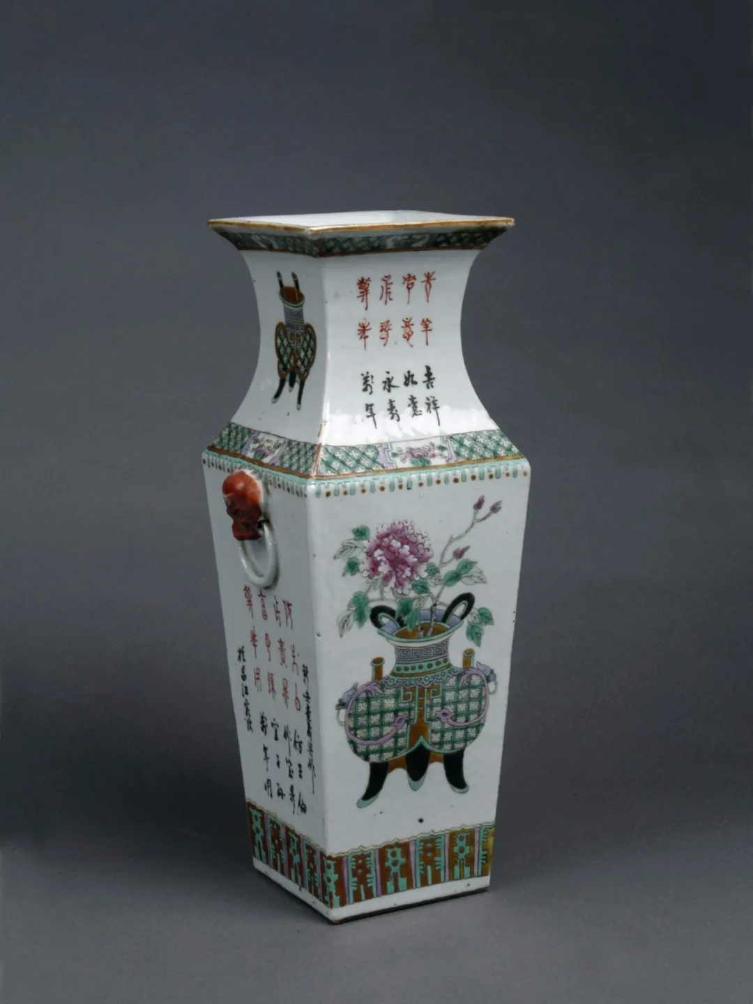 今天向大家分享的是墨书“民国元年”款五彩瓷方瓶。民国元年瓷器。白釉,方口,撇沿,束颈,腹渐收,平底,矮圈足。足端无釉,腹上部两侧堆塑两衔环铺首,颈腹部五彩饰鼎,并有篆书、行书两种文字,内容相同。有“民国元年仲秋之月书”款。保存完好。为国家三级文物。现藏于武威市博物馆。