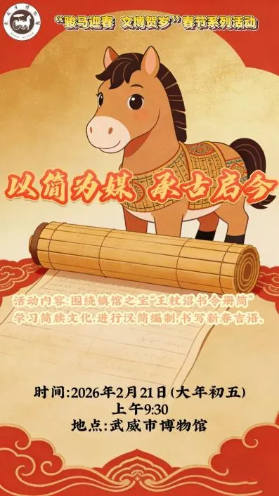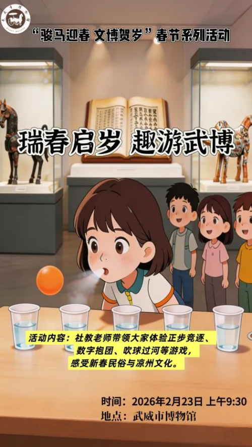 岁启丙午,骏马献瑞;文脉赓续,文博迎春。为迎接马年春节,武威市博物馆特推出“骏马迎春 文博贺岁”新春系列社教活动,以大汉天马之雄姿、凉州文脉之厚重,邀市民与游客共赴一场跨越千年的文化之约。
