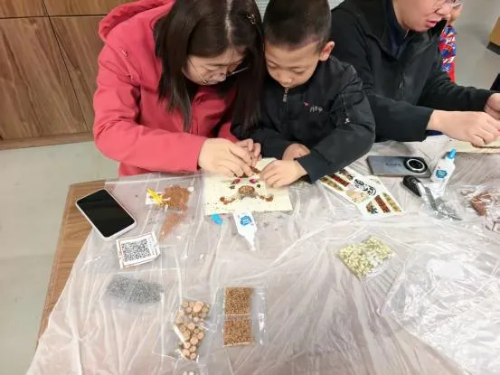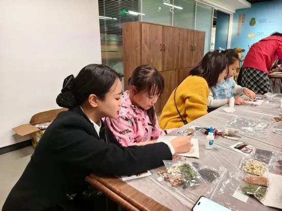 在匠心手作环节,孩子们化身“节气小匠人”,在老师指导下以中药材为原料,搭配各类谷物花草作为装饰,亲手制作中药香氛画。大家认真搭配药材、精心勾勒画面,在动手创作中感受中医药文化与手工艺术的融合之美,一幅幅香气独特、创意十足的香氛画,定格了暮春美好,也让非遗技艺在指尖传承。